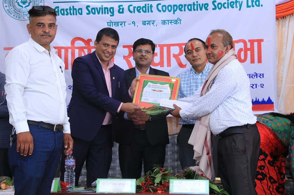 पोखरा, ६ असोज । आस्था बचत तथा ऋण सहकारी संस्था लि. पोखरा १, बगरको पन्धौँ वार्षिक साधारण सभा सोमबार सम्पन्न भएको छ । साधारण सभा उद्घाटन् गर्दै प्रमुख अतिथिको रुपमा रहेका आस्था साकोसकै सल्लाहकार डा. गंगादत्त सुवेदीले नेपाली अर्थतन्त्रमा सहकारीको अहम् भूमिका भएको र आस्था साकोसले कास्कीको सहकारी अभियानमा अग्रणी भुमिका निर्वाह गरेको बताउनुभयो । अव हरेक नागरिक उत्पादनसँग जोडिनुपर्ने, देशलाई कृषि प्रधान मात्र होइन कृषक प्रधान समेत बनाउनुपर्ने, सदस्यहरु केवल साधारण सभामा उपस्थित हुने मात्र होइन पूरा समय बसेर आफ्नो सहकारीका सम्पूर्ण गतिविधिका बारेमा जानकारी लिने, खवरदारी गर्ने, सुझाव दिने आदि कुरामा सजग रहनुपर्ने बताउनुभयो । अहिले नेपालको सहकारी अभियानमा कैयाँै चुनौतीहरु आइपरेको अवस्था रहेपनि आस्था सहकारीले सहकारी ऐन, नियम तथा मापदण्ड पालनामा विशेष ध्यान दिएकोमा निकै खुसी लागेको पनि बताउनुभयो । त्यसै गरी, सल्लाहकार लोकनाथ आचार्यले अहिले सहकारीले नाफा कमाउन सक्ने बेला नभएको र सदस्यले पनि नाफा खोज्ने बेला नभएको तर सवै सदस्य, सञ्चालक र कर्मचारीले निकै सजग भै नीति नियमनमा बसी संस्था बचाउनुपर्ने बेला भएको बताउनुभयो । कार्यक्रममा अध्यक्ष कृष्णप्रसाद आचार्यले अध्यक्षको वार्षिक प्रगति प्रतिवेदन तथा आगामी नीति तथा कार्यक्रम, कोषाध्यक्ष बद्रीराज गौतमले आर्थिक प्रतिवेदन तथा आगामी बजेट र लेखा सुपरीवेक्षण समितिका संयोजक भीमप्रसाद आचार्यले लेखा सुपरीवेक्षण समितिको वार्षिक प्रतिवेदन प्रस्तुत गर्नुभएको थियो । सोही अवसरमा संस्थाका सञ्चालक बसन्त कुमार आचार्यले स्थापना गरेको संस्था प्रवद्र्धन तथा विकास पुरस्कार (१) बाट संस्थाका पुर्व सञ्चालक श्री लक्ष्मी गुरुङ सम्मानीत भएकी छन् भने सदस्य श्री शिवप्रसाद पौडेलले पिता स्व. नारायणप्रसाद पौडेलको स्मृतिमा स्थापित संस्था प्रवद्र्धन तथा विकास पुरस्कार (२) बाट लेखा सुपरीवेक्षण समितिका पूर्व सदस्य श्री गिरधारी तिमिल्सिना, सदस्य गुणराज÷पार्वती आचार्यले स्थापना गरेको जेहेन्दार विद्यार्थी पुरस्कारबाट प्रीती आचार्य, सदस्य घनश्याम आचार्यबाट स्थापित स्व.गुरुप्रसाद आचार्य स्मृति पुरस्कारबाट माध्यमिक शिक्षा उत्तिर्ण विद्यार्थी सदिक्षा बास्तोला सम्मानित भएका थिए । त्यसै गरी, जेष्ठ सदस्यको रुपमा श्री मित्र कुमारी गुरुङ, उत्कृष्ठ कर्मचारीको रुपमा रामप्रसाद शर्मा, उत्कृष्ठ कारोवारीको रुपमा आइबहादुर भन्ने सन्तलाल परियार, वर्ष असल सदस्यको रुपमा शिक्षा उपसमितिकी संयोजक हसिना बस्नेत र सदस्य पुर्ण बहादुर गुरुङ, आस्था उद्यमशीलता पुरस्कारबाट सदस्य श्री सन्तोष प्रधान सम्मानित हुनुभएको थीयो । साधारण स