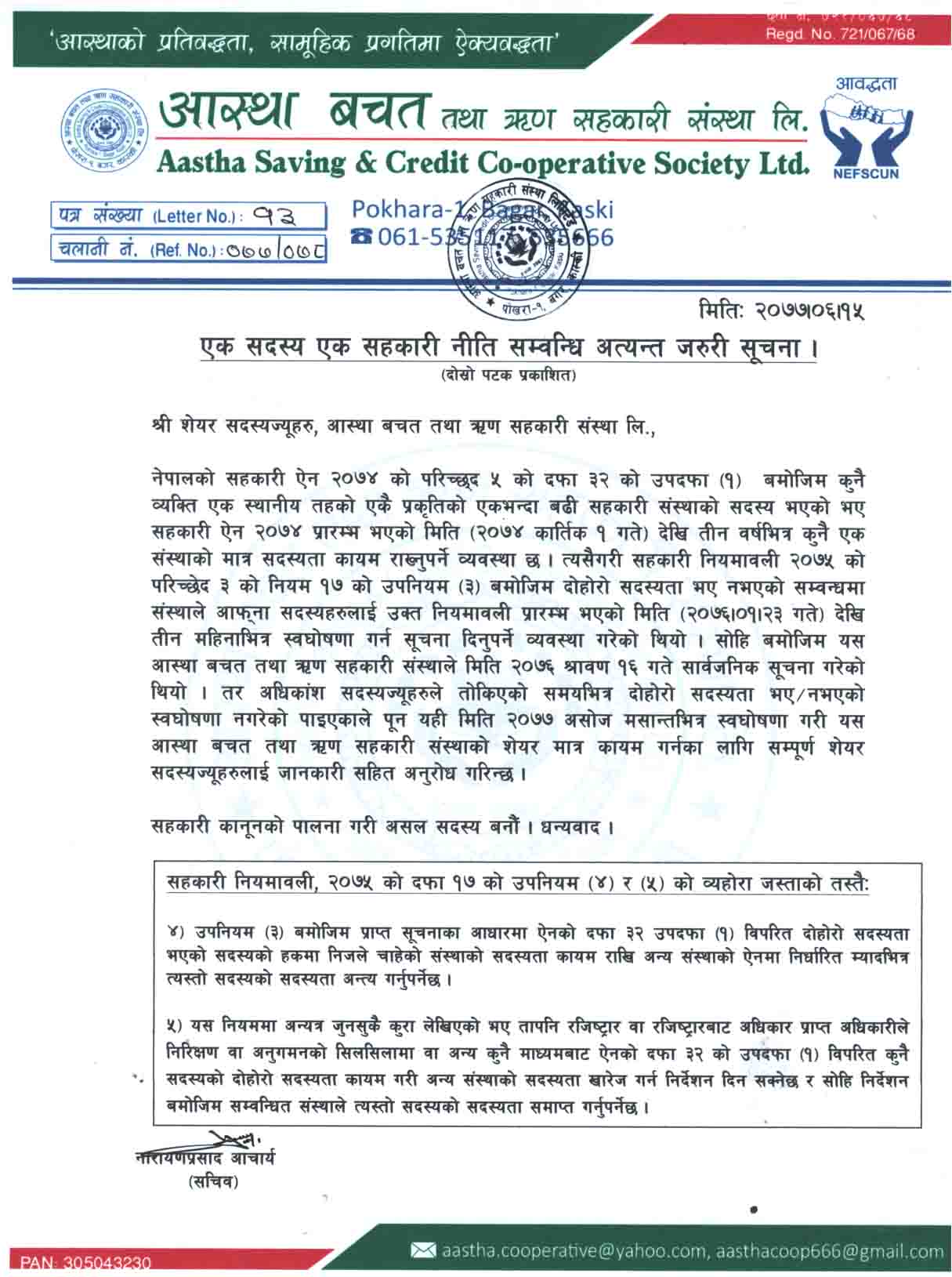 सहकारी एेन २०७४ बमाेजिम कुनै व्यक्ति एक स्थानिय तहकाे एकै प्रकृतिका एकभन्दा बढी संस्थाकाे सदस्य हुन नपाउने व्यवस्था गरेबमाेजिम २०७७ असाेज मसान्त सम्ममा सुचनामा जारी गरेबमाेजिम यस अास्था साकाेसकाे सदस्यता मात्र कायम गरिदिनुहुन बिनम्र अनुराेध गर्दछाै । थप जानकारीकाे लागी कार्यालय समयमा निम्न नम्बरमा सम्पर्क गर्नुहाेला । ०६१–५३५११७ तथा ०६१–५३५६६६
