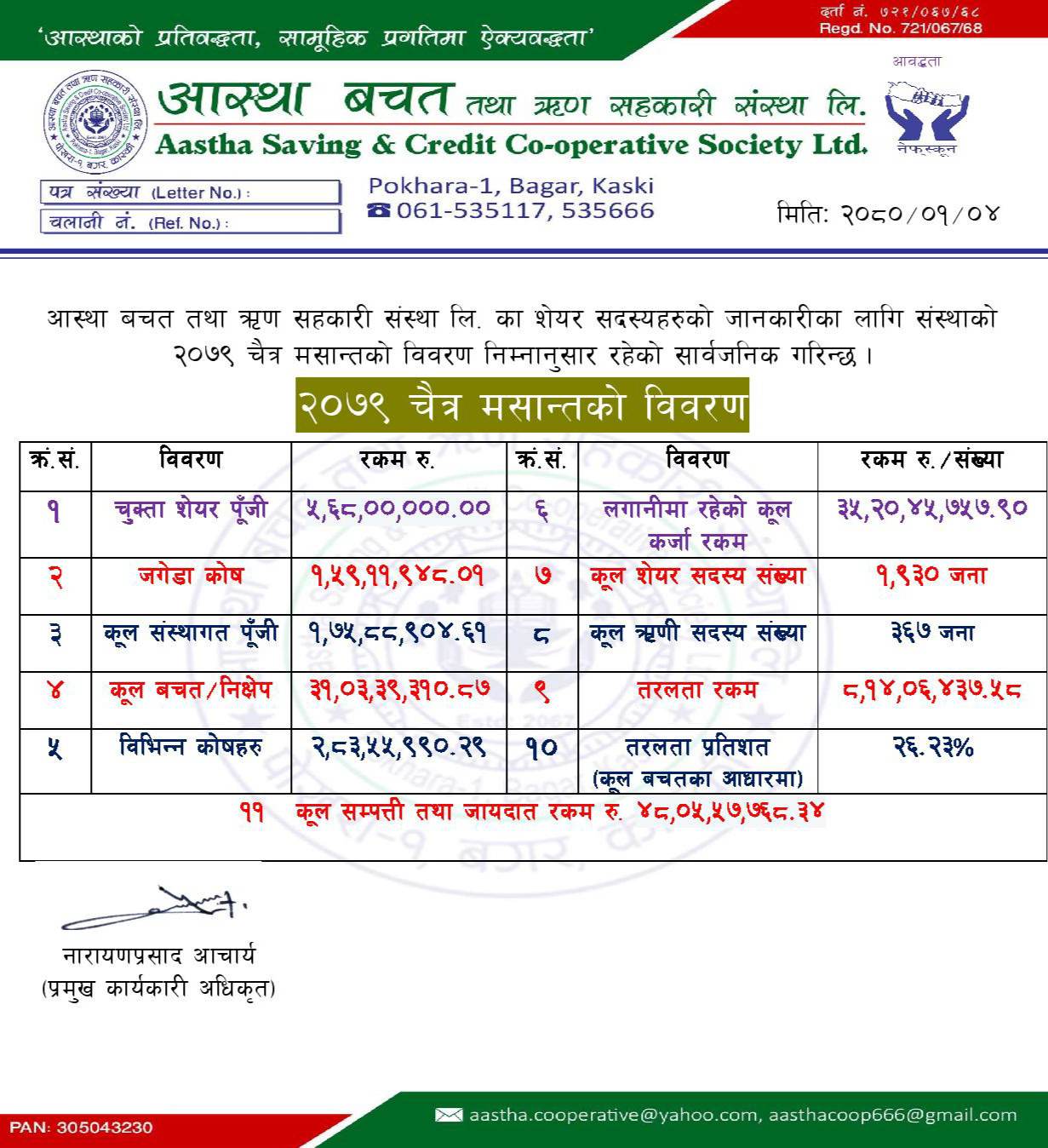आस्था बचत तथा ऋण सहकारीका सदस्यहरुकाे जानकारिका लागि प्रकाशन गरिएकाे मासिक विवरण २०७९।१२।३०