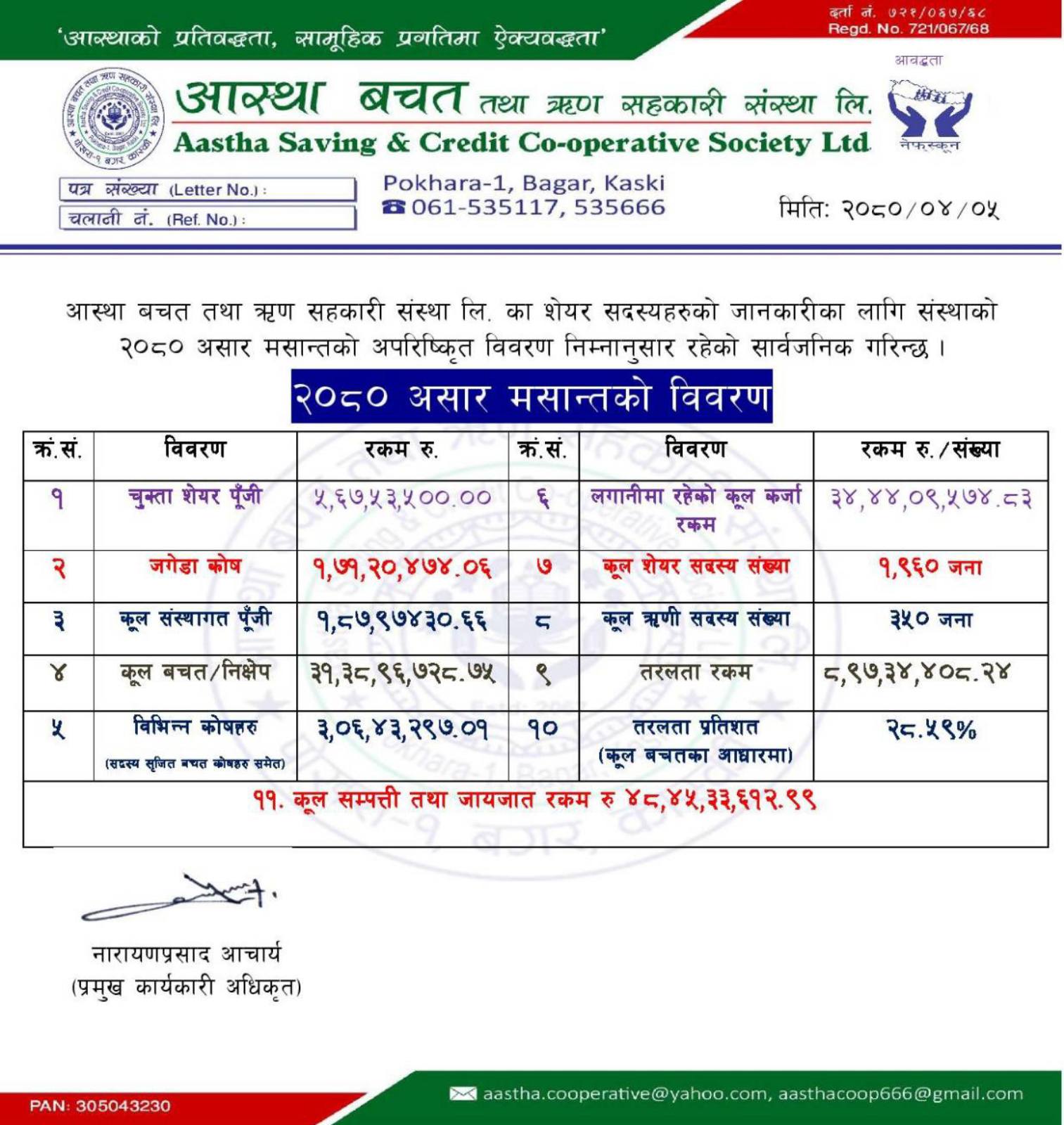 आस्था बचत तथा ऋण सहकारी संस्था लि पाेखरा १ बगरकाे २०८० असार मसान्तकाे अपरिष्कृत विवरण निम्नानुसार भएकाे सम्पुर्ण शेयर सदस्यहरुकाे जानकारीका लागि अनुराेध छ ।