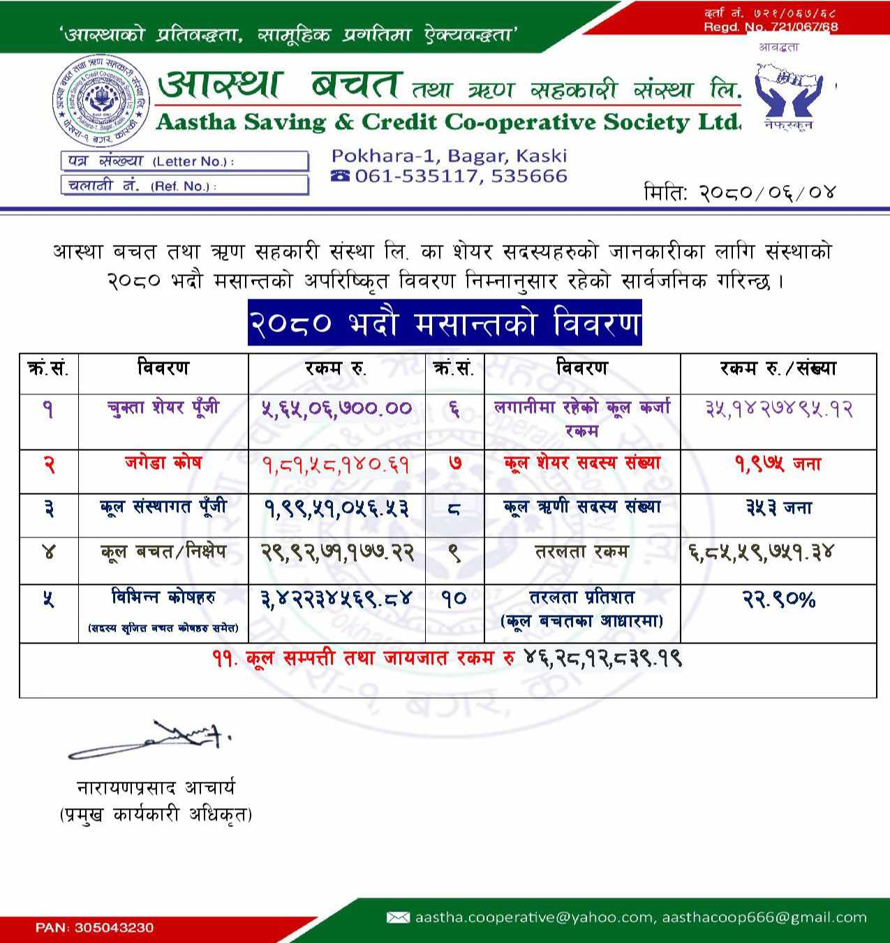 सहकारी विभागकाे निर्देशन बमाेजिम प्रकाशन गरिएकाे मासिक विवरणः २०८० भदाै मसान्त ।