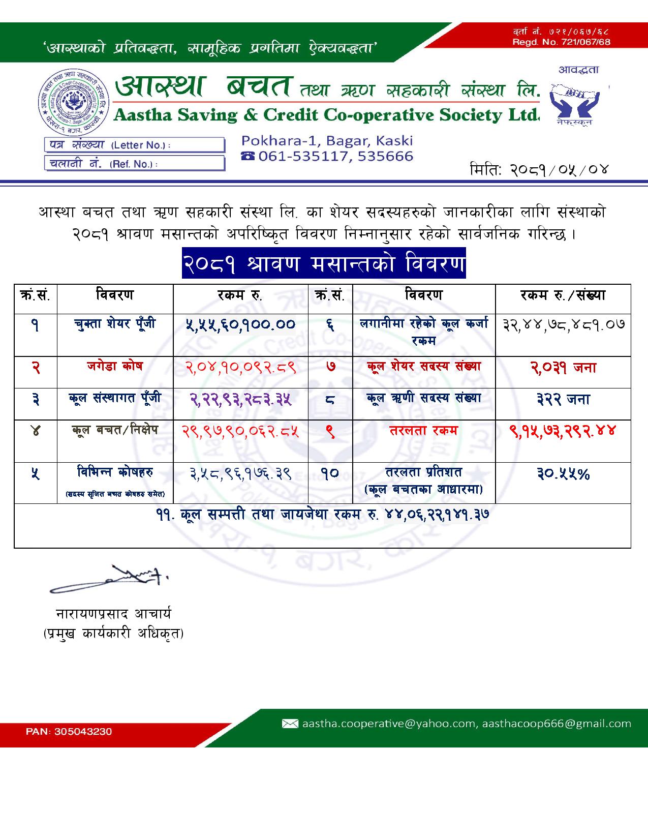 Unaudited Report of Aastha SACCOS For the month of Shrawan 2081