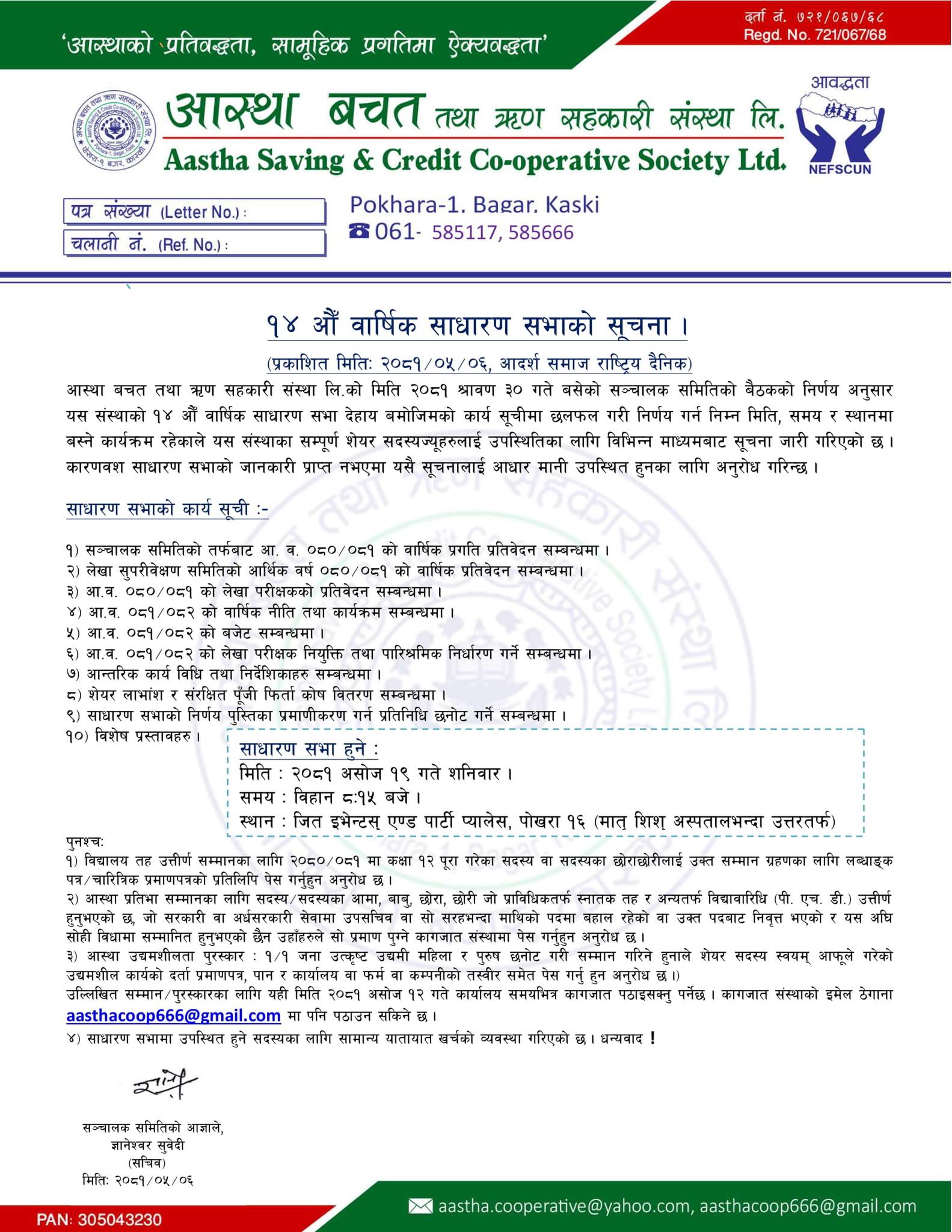 १४ औ साधारण सभा मिति २०८१-०६-१९ शनिबार . समय बिहान : ८:१५ बजे स्थान : जित इभेन्ट्स पोखरा १६